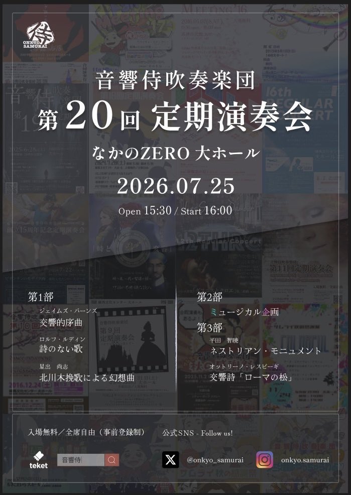 • 音響侍吹奏楽団 第20回定期演奏会は、記念すべき節目にふさわしい、多彩で聴き応えのあるプログラムでお届けいたします。